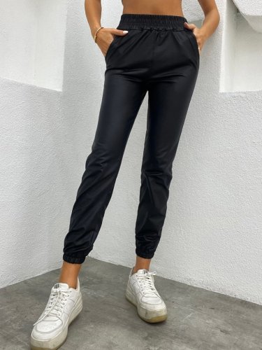 Kadın paçası lastikli cep detaylı deri tayt pantolon