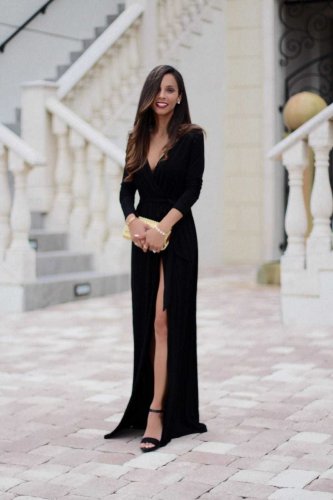 • Kadın uzun kollu derin V kruvaze yaka beli lastik yırtmaç ve bağcık detaylı sandy tam boy elbise